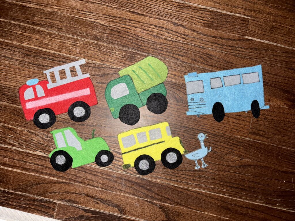I hid the pigeon behind one of the vehicles and had kids guess where he was using the color and vehicle. We played this three times and then at the end of storytime, I left it on the flannel board so they could take turns playing!